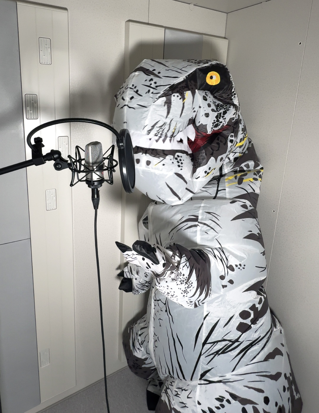 人類向けのスタジオとして準備していたため、ティラノサウルスが収録ブースに入れるかが懸念点でしたが、当日は無事に歌収録を終えることができました。